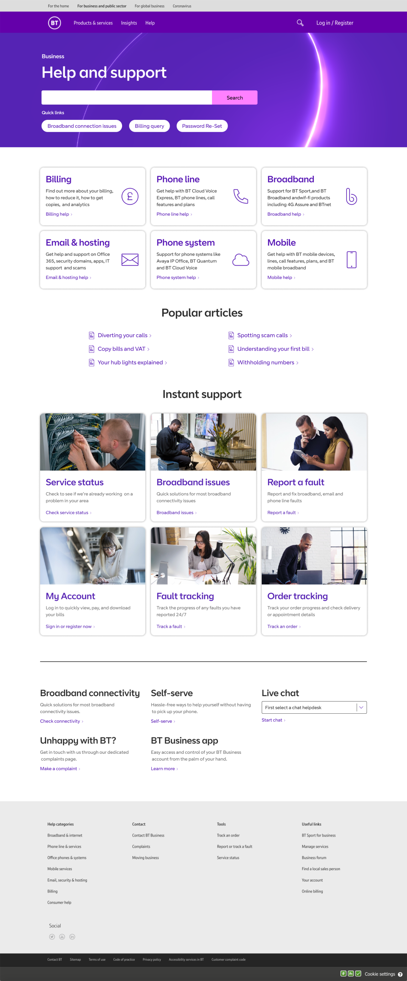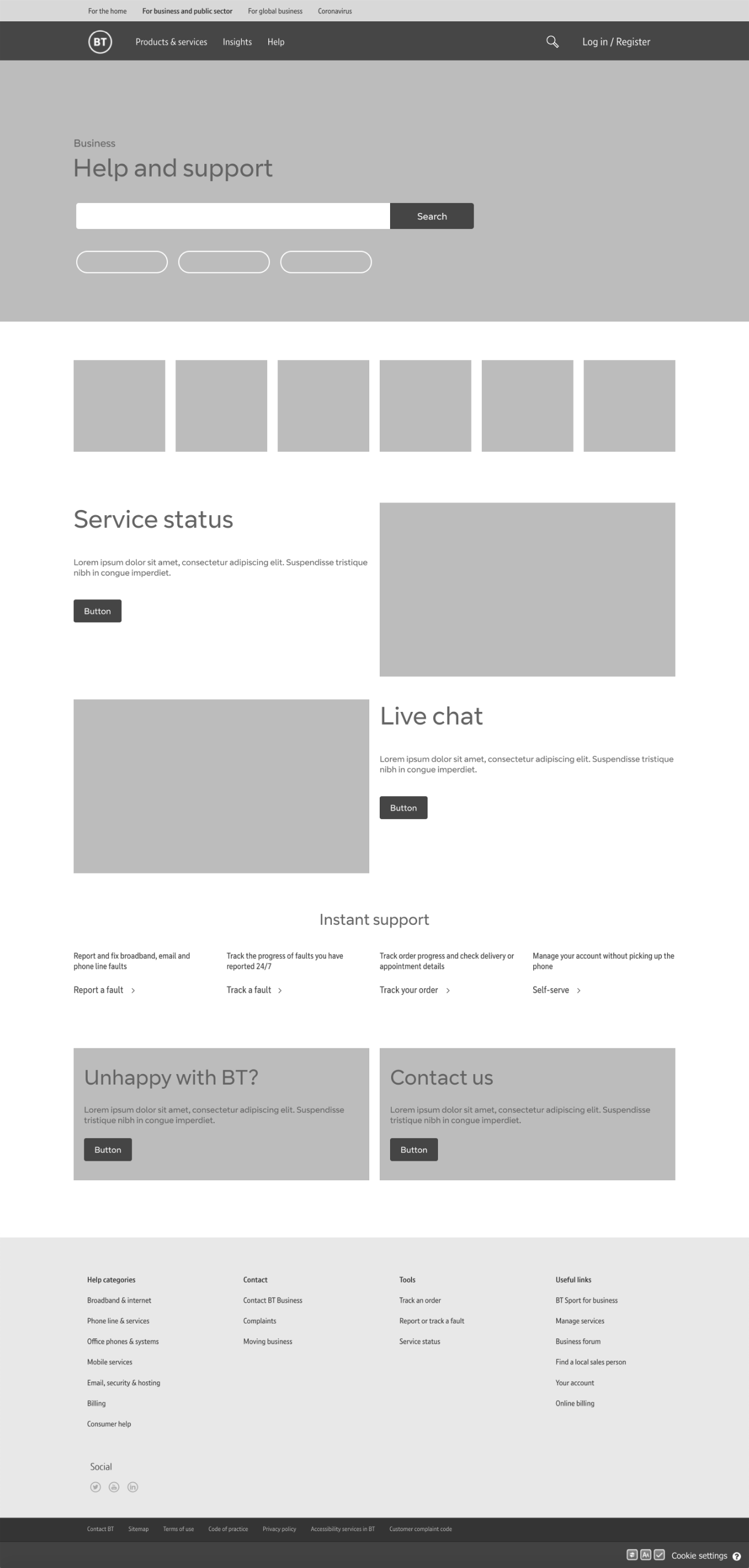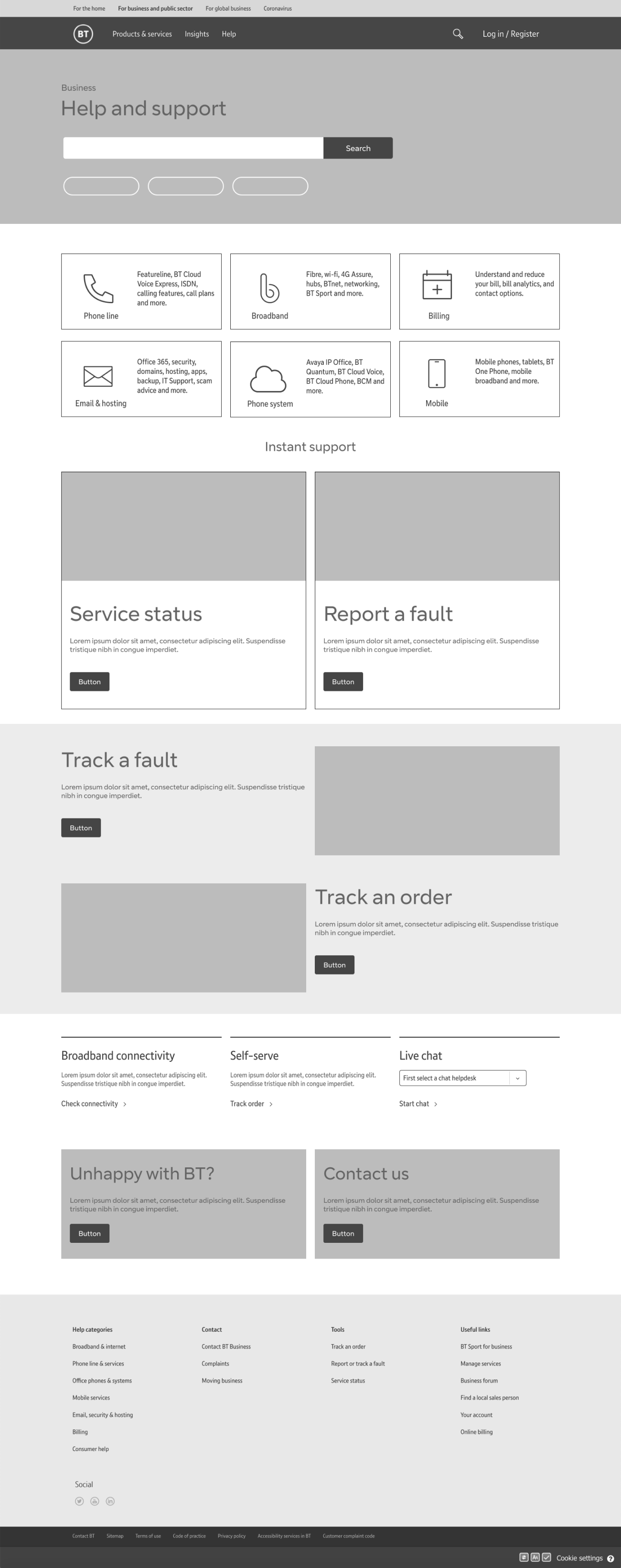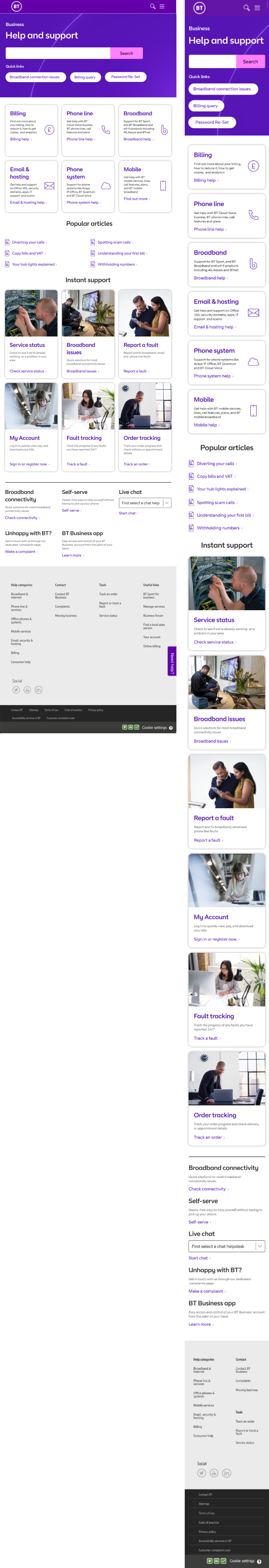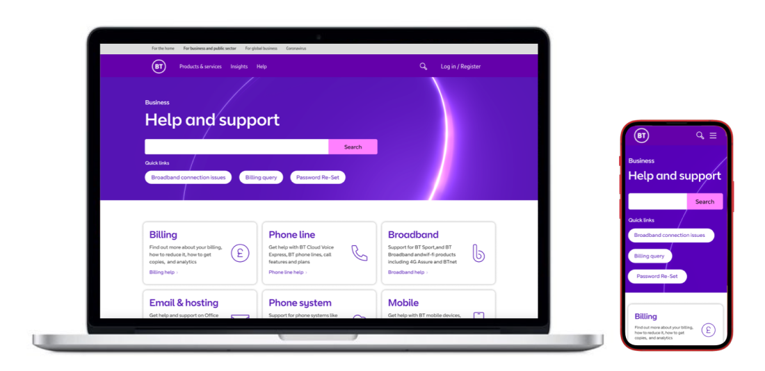 Working directly with BT & EE Business via EPAM Systems, I was integrated into the SME Help & Support squad as the sole experience designer for a digital transformation project. Promoting a digital first approach aiming to reduce calls and call waiting times for BT & EE business customers. Working across both brands I redesigned both help home landing pages and contact us sections also looking at areas such as complaints and BT help category pages. On the EE side; working with the UR I was involved with research such as agent interviews, card sorting & for BT help home user testing.