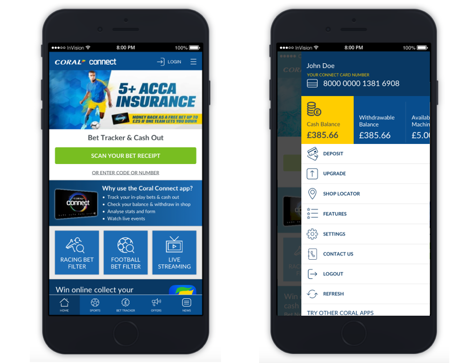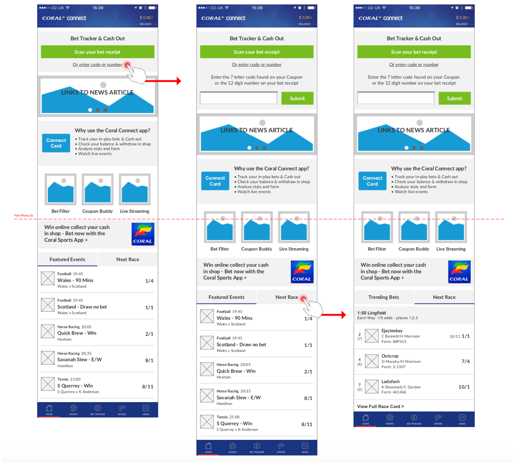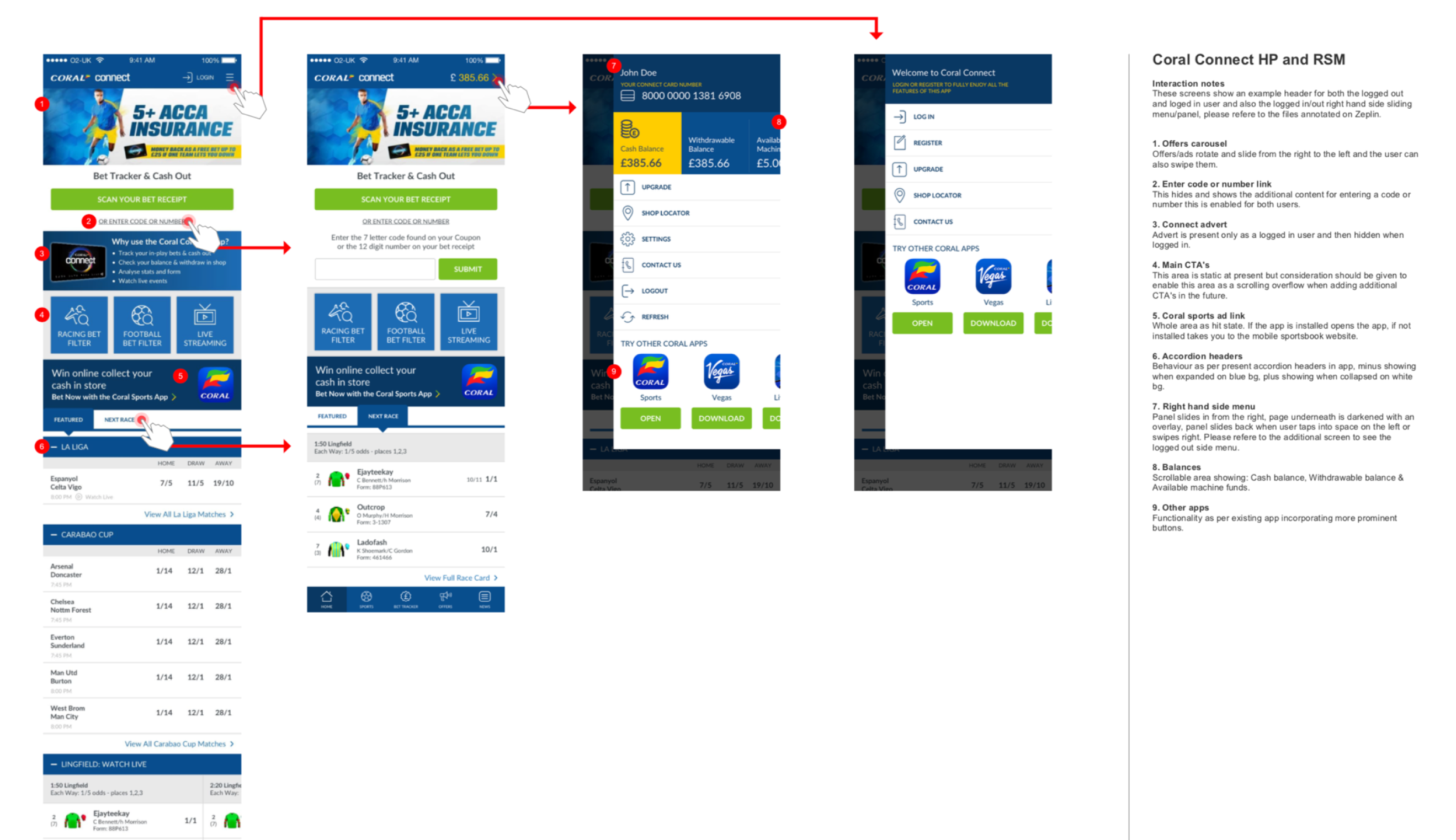 Omni channel work redesigning & implementing UX improvements for two retail apps being: Ladbrokes The Grid - Responsive web, iOS & Android hybrid app. Coral Connect - iOS & Android native app. Also occasional Sports book tasks. Using mainly Sketch, Photoshop, Invision & Axure